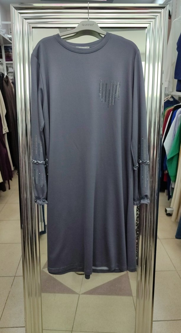 Uzun kollu, bisiklet yaka gri tunik, zincir detayları ve nakış desenleriyle günlük rahat şıklık sunar.