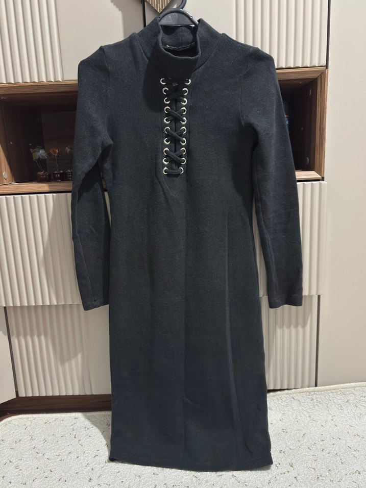 Uzun kollu, yüksek yakalı ve zincir detaylı bu gri elbise, yumuşak sentetik kumaştan üretilmiştir. Gotik tarzda ofis kullanımı için uygundur. Marka temsilidir.