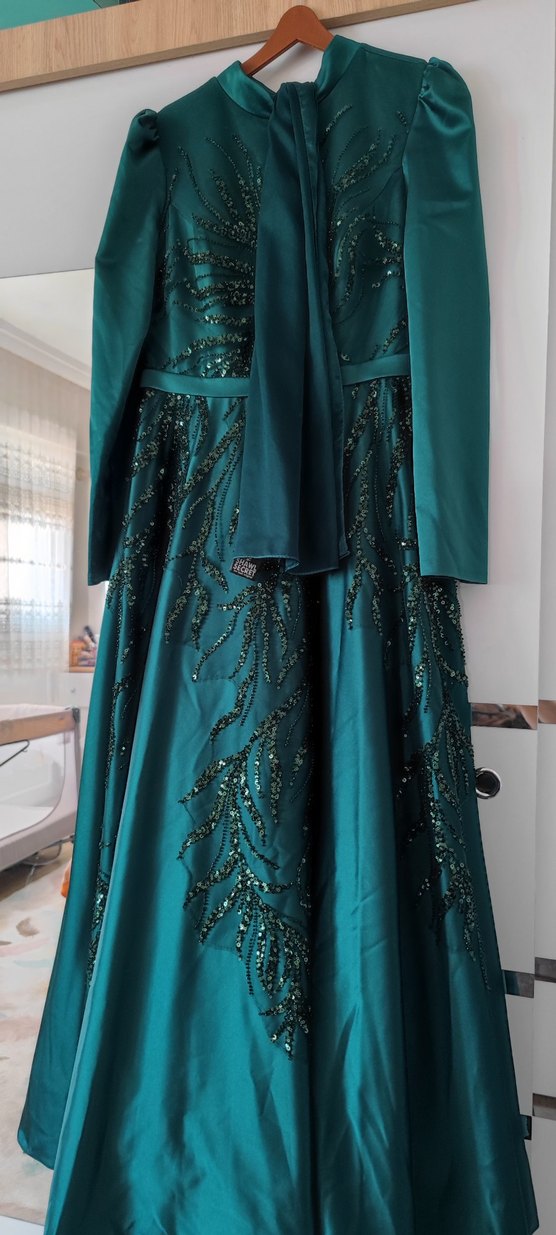 Zümrütyeşili tesettür abiye bir defa giydim şalıyla beraber vereceğim 44beden ama dar kalıbı 70 kiloysanız olmaz