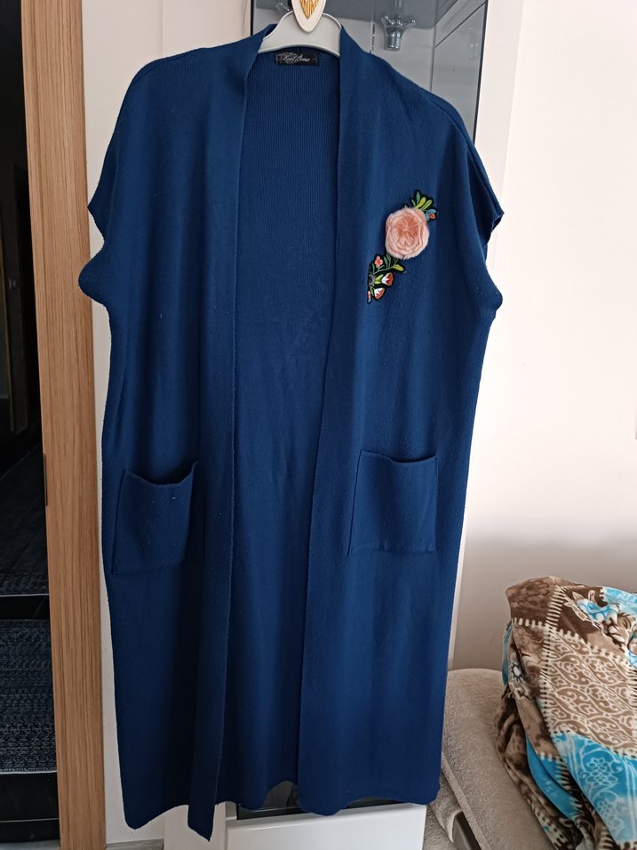 Uzun, kolluksuz kadın sabahlık, bol kesim ve koyu mavi nakışlı çiçek detaylarıyla bohem Paris tarzını yansıtıyor.