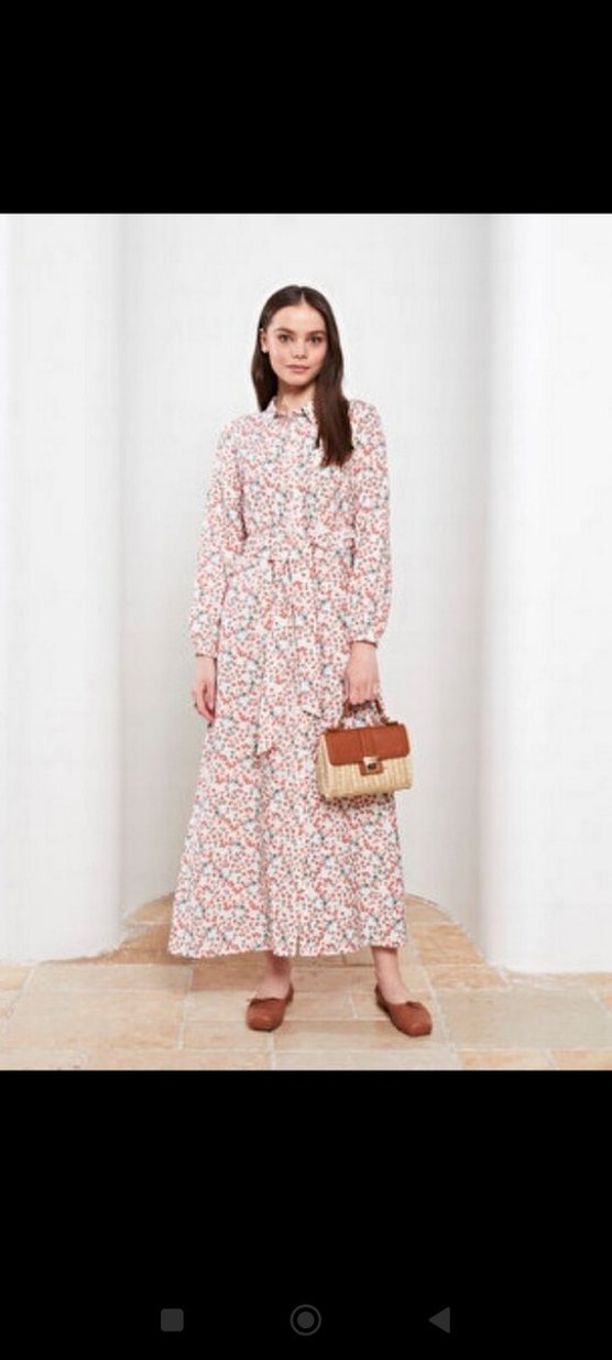 Uzun kollu, kuşaklı ve bol kesimli uzun elbise. Bej renkli, pastel tonlarda batik desenli ve tekne yaka detaylıdır. Günlük kullanıma uygundur. kesinlikle deformesi yoktur boyu 135cm, göğüs ölçüsü 56cm
