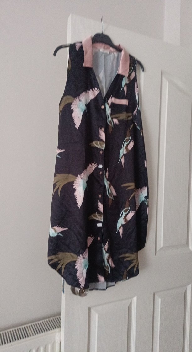 Uzun, kolsuz ve bol kesim kadın elbisesi, koyu tonlu tie-dye desenli ve kuş motifli bohem tarzında. ️