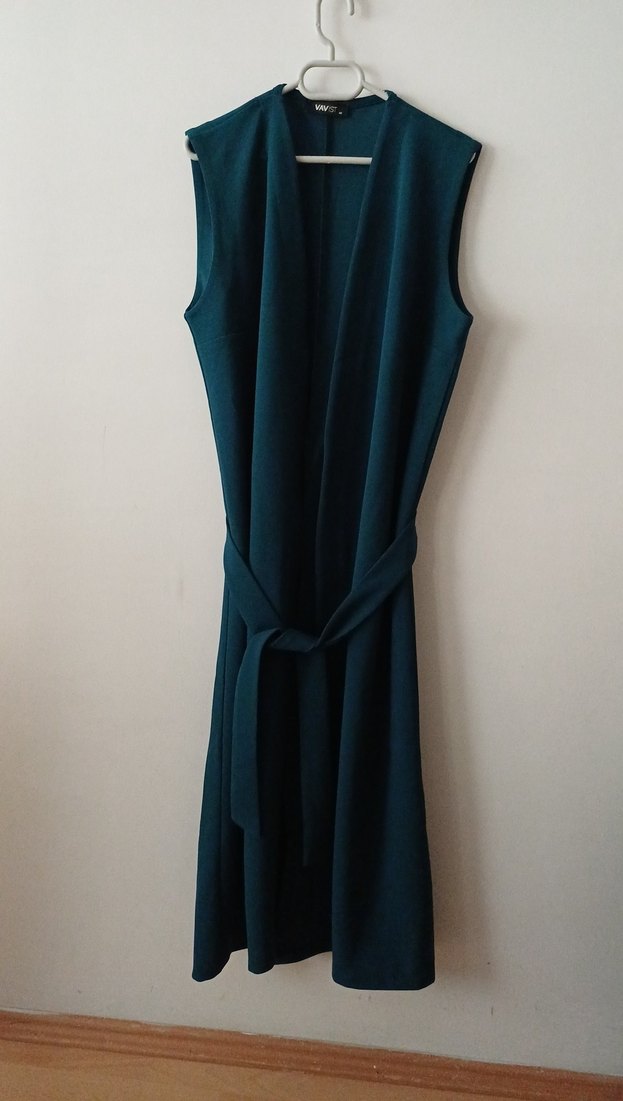 uzun ve kolsuz, belden bağlamalı minimalist tarzda kadın yelek ve ispanyol paca pantolon takım