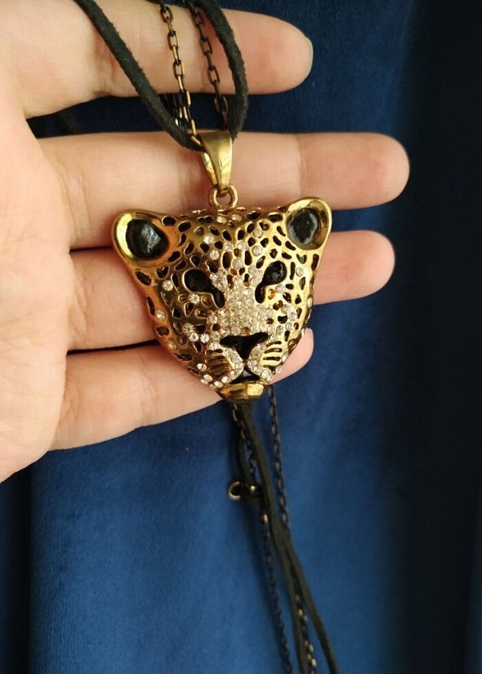 Aslan görünümlü parlak taşlı siyah altın renk detaylı çift askılı uzun boy kolye.
