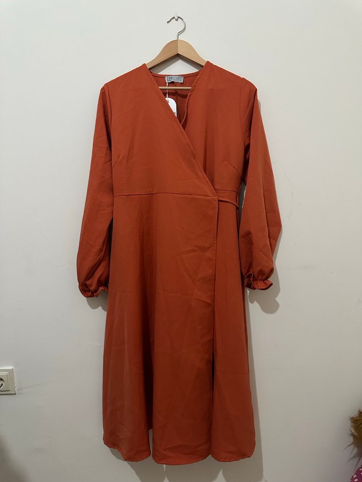 Kadınlar için uzun, bol kesim, drapeli ve uzun kollu elbise. Yumuşak sentetik kumaştan, koyu kahverengi ve V yakalı. Ofis için uygun, sade ve desensiz tasarım.
