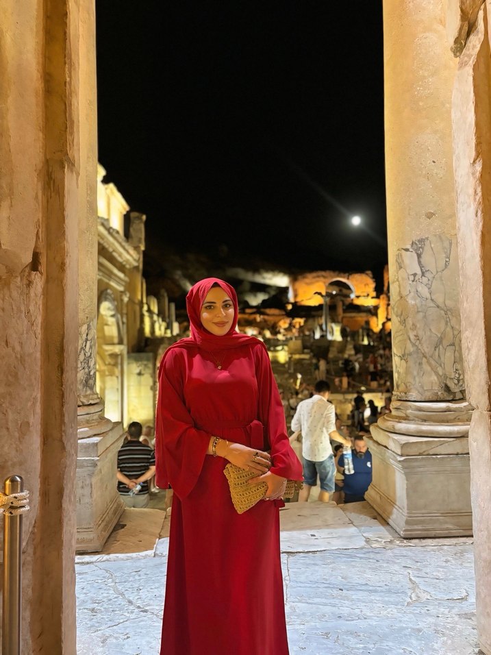 Uzun, koyu kırmızı renkte, yüksek yakalı ve uzun kollu drapeli kadın elbisesi. Regular kesim ve etnik desenli, düğünler için minimalist tarzda bir model.