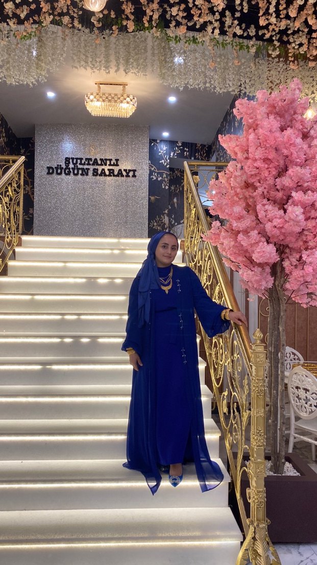 Uzun, koyu mavi renkli bu abiye, yüksek yakalı ve etnik desenlidir. Askılı kollu, düzenli kesim ve drapeli tasarıma sahiptir, düğünler için uygundur. ✨