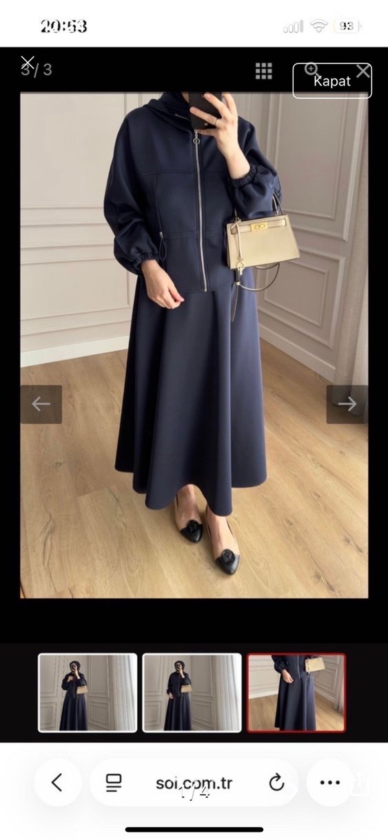 Kadınlar için uzun, koyu renkli elbise, rahat kesim ve askılı kollara sahiptir. Sentetik kumaştan yapılmış, yakası kesimli ve ofise uygun şık bir modeldir. Bej rengi Scuba kumaş ıkılı takım 38 beden ama 40 bedene de olur