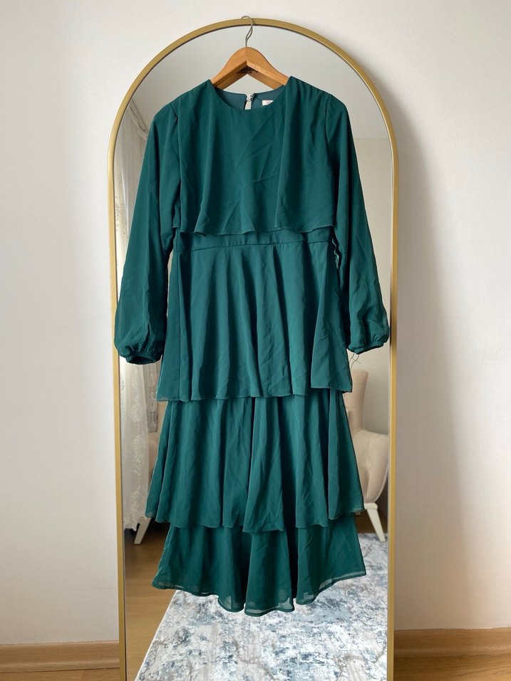 Koyu yeşil, uzun kollu, yuvarlak yakalı, bol kesim ve fırfırlı detaylara sahip uzun elbise, ofis kullanımı için uygundur.
