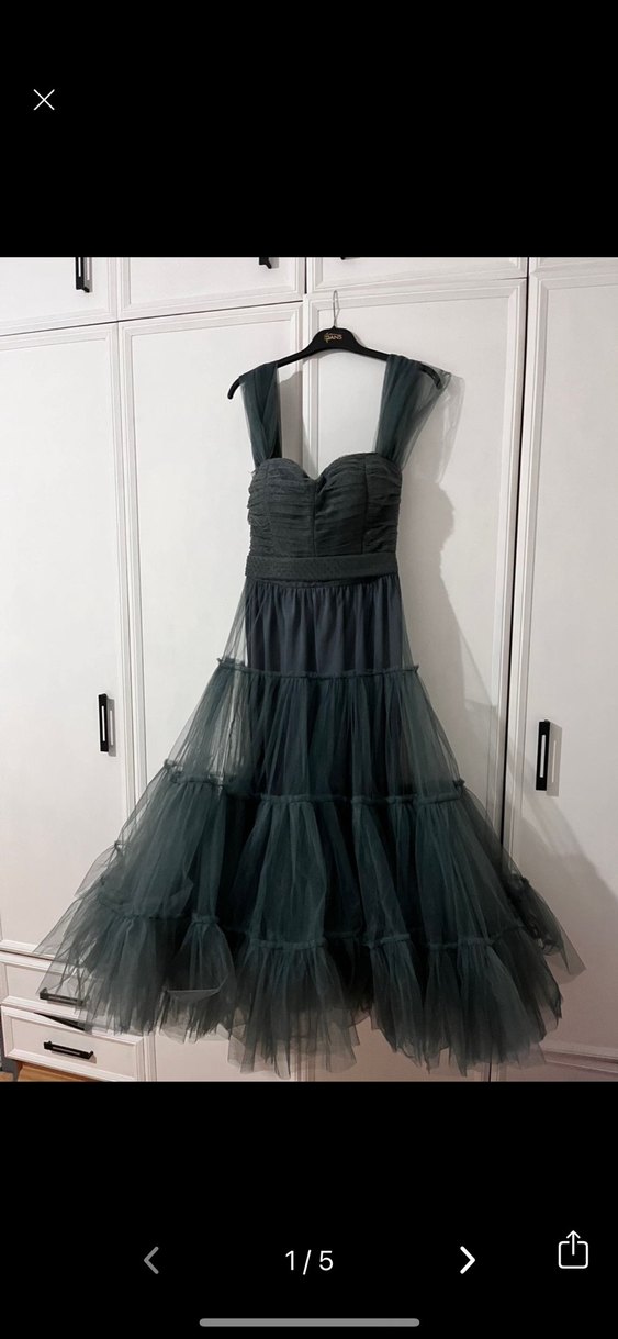 Fitted kesim, uzun koyu yeşil abiye elbise; straplez yaka ve drapeli ince askılı kollara sahip. Katmanlı tül etek gotik stil katıyor, düğün için uygun.