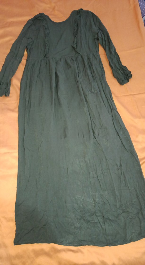 Koyu yeşil renkli uzun keten elbise, bol kesim ve drapeli detaylara sahiptir. Uzun kollu ve yuvarlak yakalıdır, bohem tarzını yansıtır.