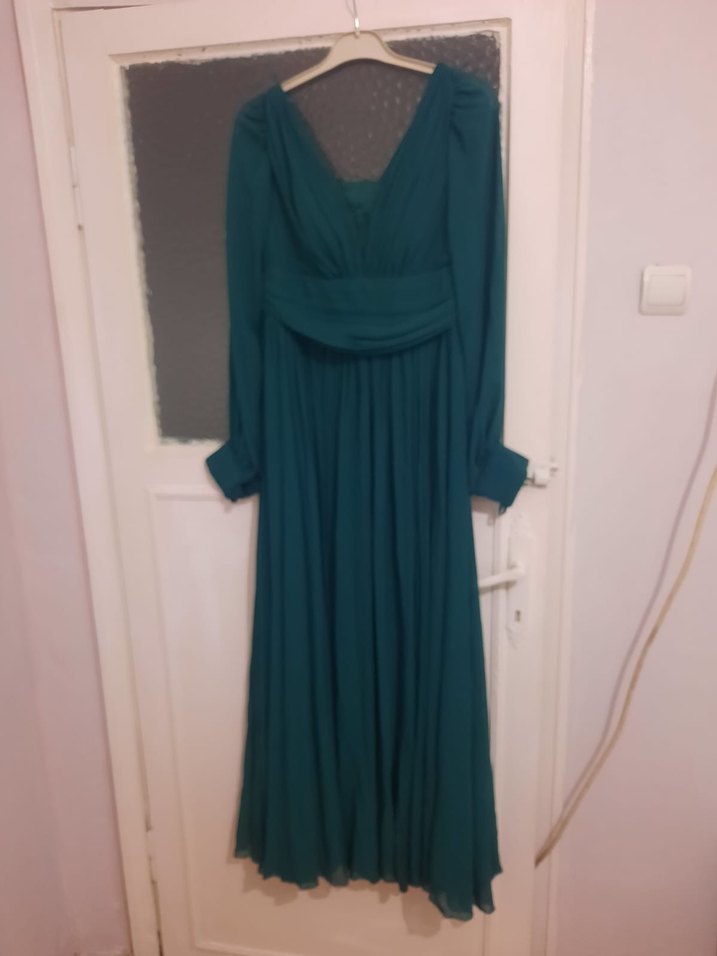 Uzun, bol kesim kadın elbisesi, drapeli tasarımı, V yakası ve uzun kolludur. Koyu yeşil renkli ipeksi kumaştan yapılmıştır, düğünler için uygundur.