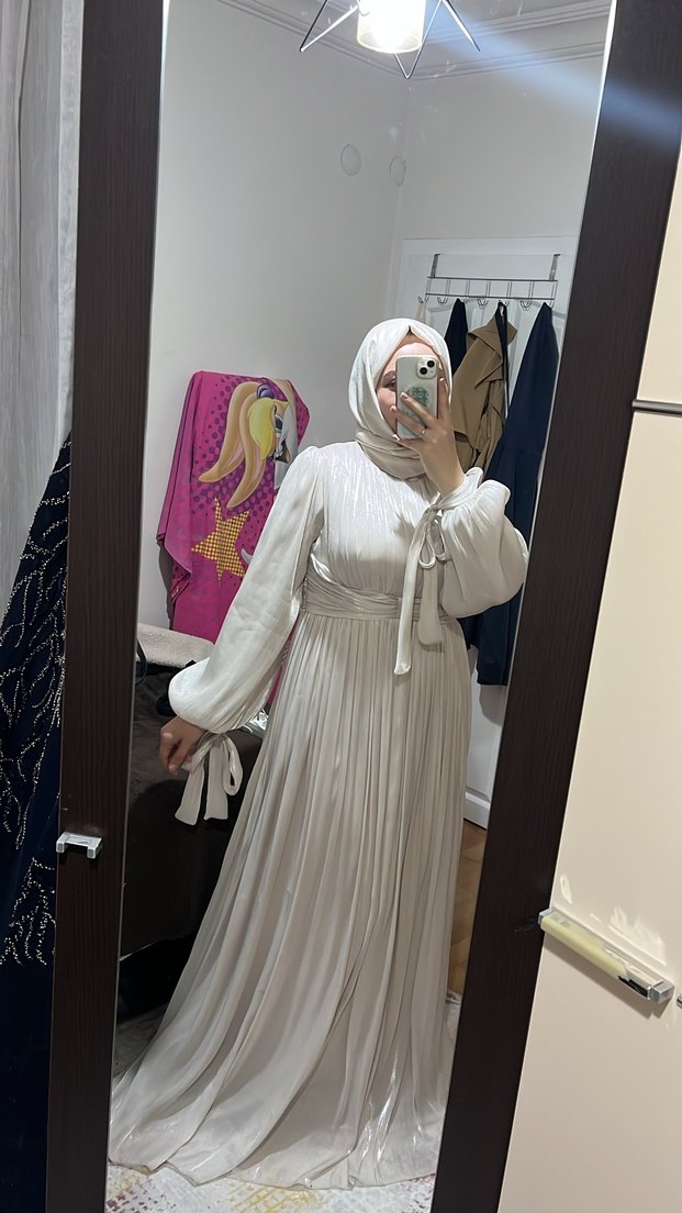 İpek gibi kumaştan, uzun ve bol kesim krem kadın elbisesi. Kolları bağcıklı ve yüksek yakalı, sade bohem tarzda, düğünler için uygun.