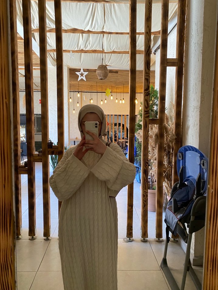 Uzun krem rengi triko elbise