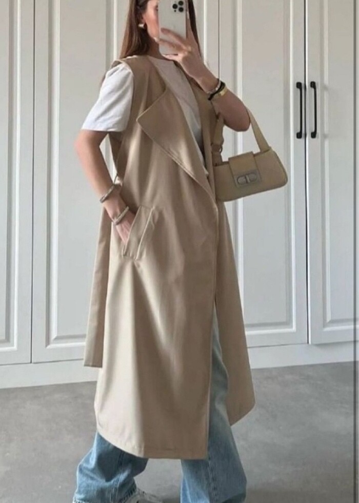 Uzun krem kolsuz trenckot