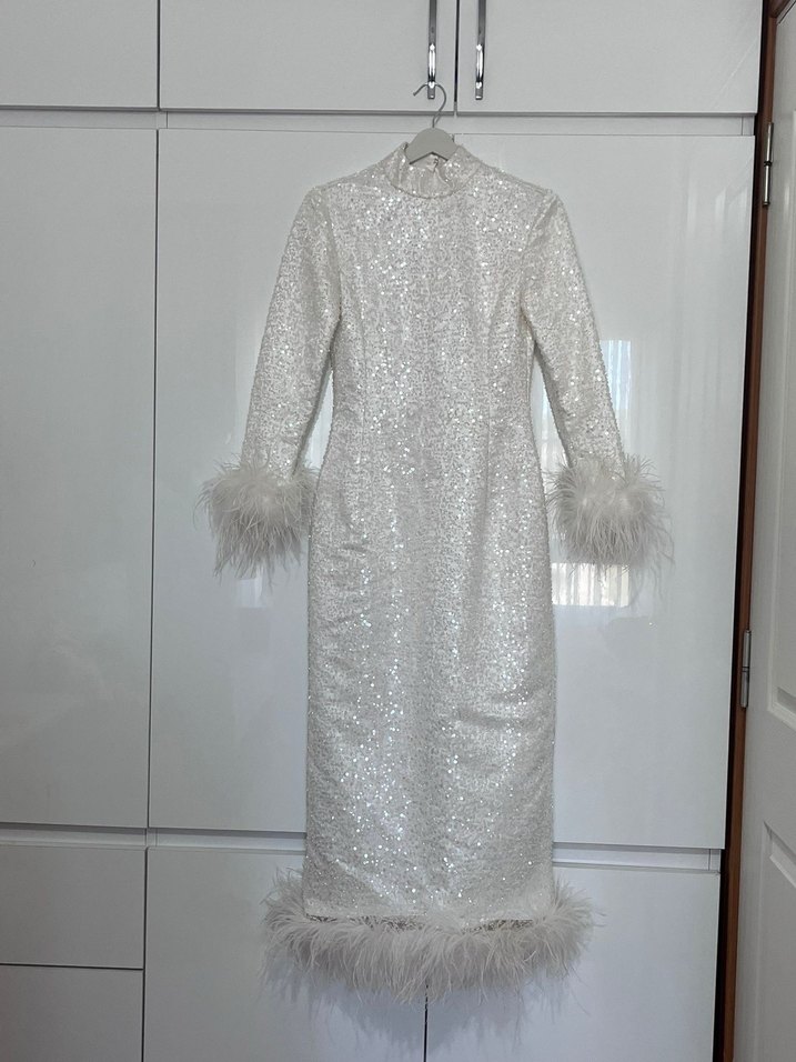 Bu uzun, beyaz gelinlik dar kesim olup yüksek yakalı ve uzun kolludur. Modern klasik tarzda parlak kumaş ve kürk detaylarıyla avant-garde moda severler için uygundur. ✨ Özel dikimdir 36-38 bedenle uyumludur 1.50 metre şal ile gönderilecektir