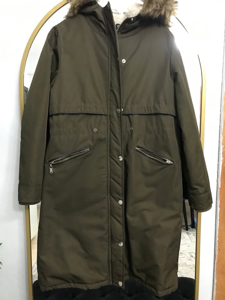 uzun mont, kürklü kapüşon ve kesik yaka detayına sahiptir. Sentetik kumaştan, uzun kollu ve fermuarlı ceplidir. 42 bedene olur yıkaması yapılmamıştır