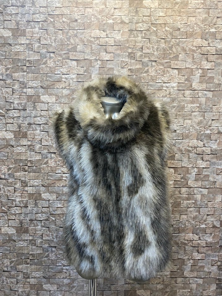 sentetik kumaştan yapılmış, zebra desenli, uzun ve kolsuz kadın yeleği. Yüksek yakalı ve kürk detaylı, rahat kesimlidir.