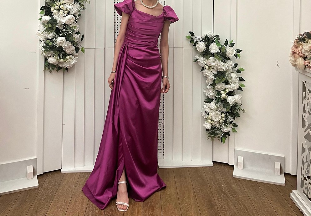 Uzun saten kuyruklu abiye elbise, drapeli tasarımı, kayık yaka ve ince askılı kollarıyla dikkat çeker. Parlak kumaşı ve klasik şıklığıyla düğünler için uygundur.