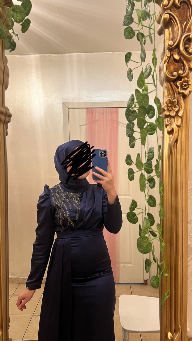 Uzun siyah abiye elbise, yüksek yakalı ve uzun kollu. Drapeli tasarımı ve hafif tie-dye deseniyle düğün ve şık sokak stilleri için uygun. 1 kere giyinildi