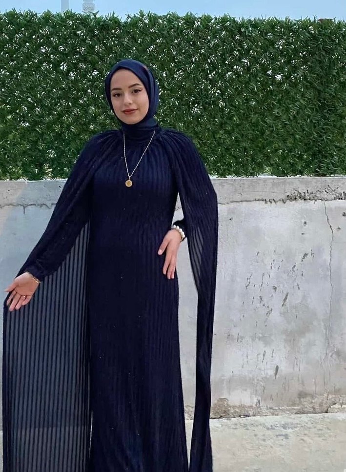 Yüksek yakalı, uzun kollu ve drapeli tasarıma sahip uzun lacivert elbise. Gotik tarzda, modest ve regular fit, sentetik kumaştan üretilmiştir. şal dahil