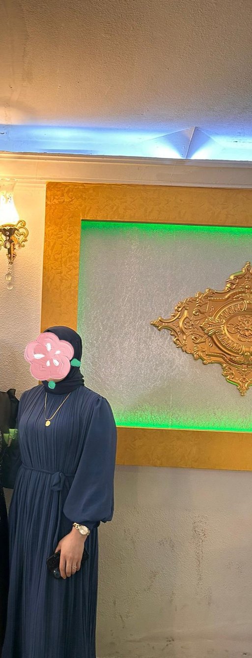Uzun lacivert elbise, yüksek yakalı ve drapeli detaylara sahip. Bağcıklı kollu ve bol kesimli, sade tie-dye deseniyle günlük kullanım için uygun.