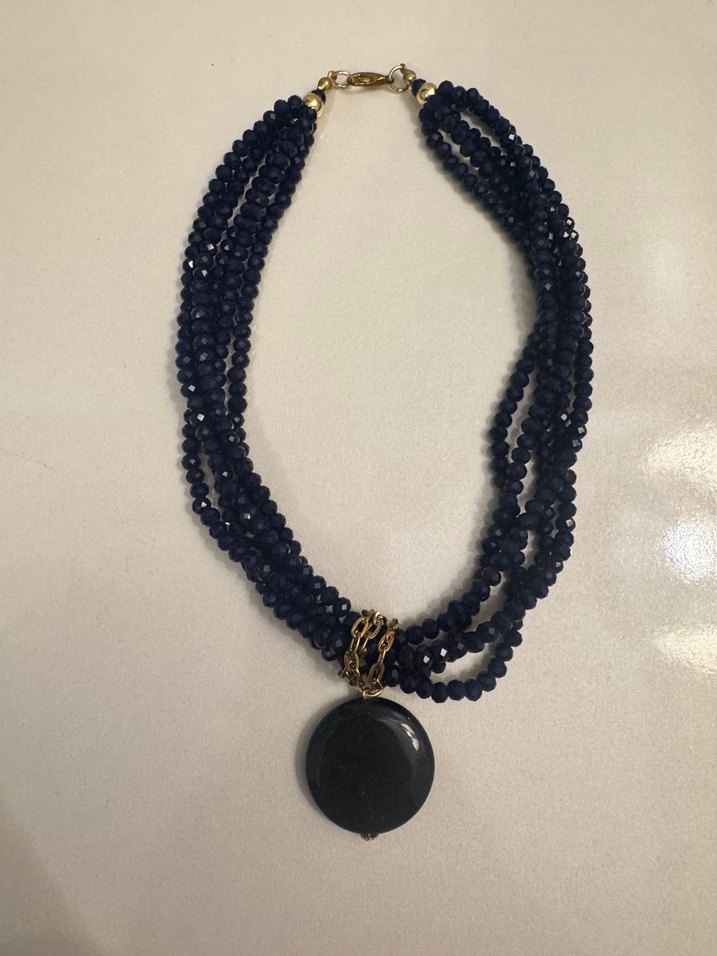 Büyük yuvarlak kolye ucu ve uzun lacivert boncuklardan oluşan kadın kolyesi, günlük ve şık kullanıma uygun.Sıfır ürün