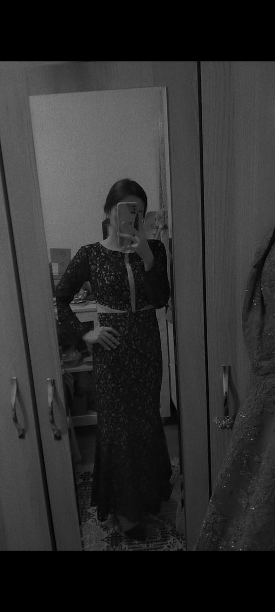 Uzun, lacivert dantel detaylı, yüksek yakalı ve uzun kollu, klasik gotik tarzda, desenli ve vücuda oturan elbise.