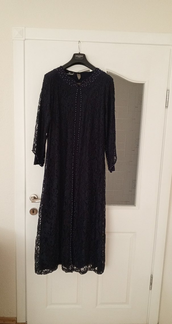 lacivert uzun dantel işlemeli elbise, yüksek yaka ve uzun kollu tasarımıyla modest ve bol kesimdir. Düğünler için uygundur.