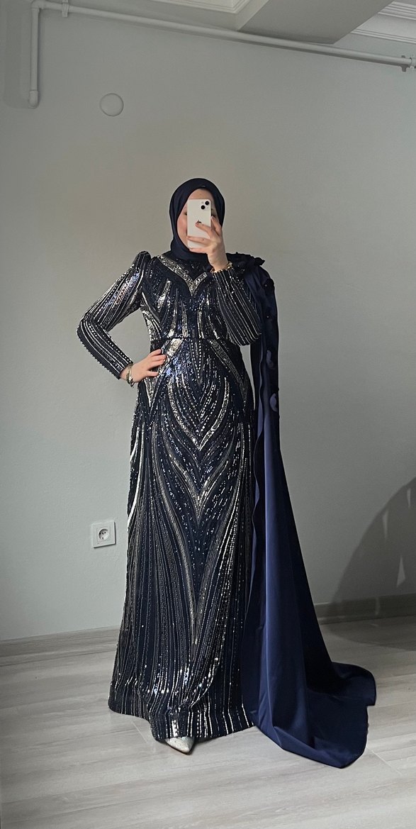 Uzun kollu, yüksek yakalı, drapeli ve desenli lacivert abiye elbise, gösterişli ve mütevazı tarzlar için uygundur. ✨şal dahil 2000 tl 36-40 beden 0544 561 20 78