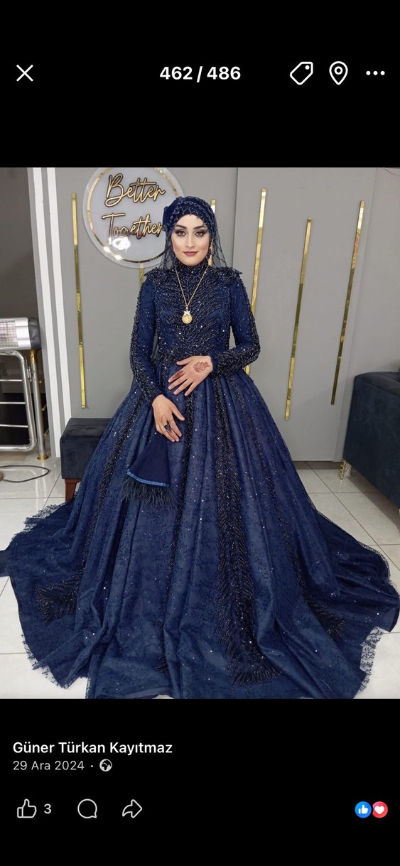 Lacivert renkte, yüksek yakalı ve uzun kollu, drapeli desenli uzun abiye. Düzenli kesimiyle mütevazı ve gösterişli, düğün için uygun bir model. ✨