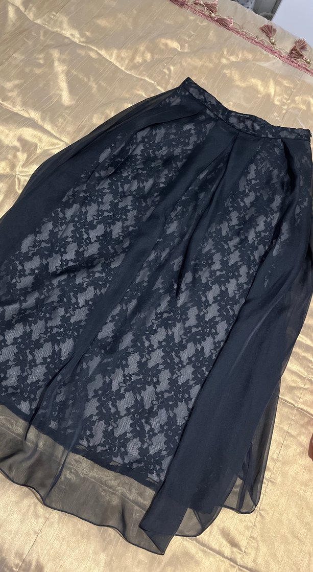 Lacivert, dökümlü ve bol kesim uzun etek, ipeksi kumaştan. Gotik tarzıyla ofis kullanımı için uygun.