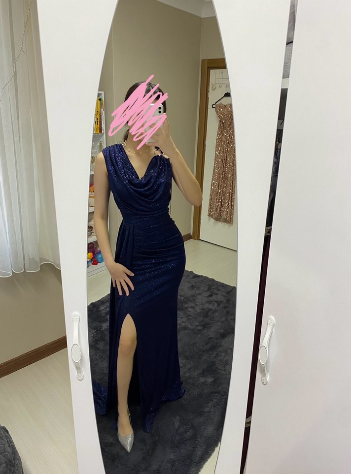 Bu uzun, fitted lacivert abiye elbise drapeli V yaka ve ince askılara sahiptir. Parlak renk ve çağdaş tasarımıyla partiler için uygundur. kilo:52 boy :168