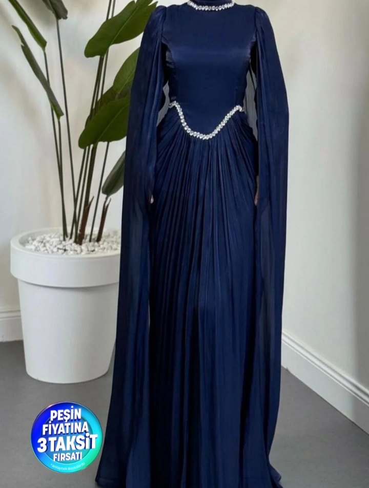 Uzun lacivert drapeli abiye elbise, yüksek yaka ve uzun kollu modern klasik tarzda, düğünler için uygun, düzenli kesim ve hafif parlak kumaşla.