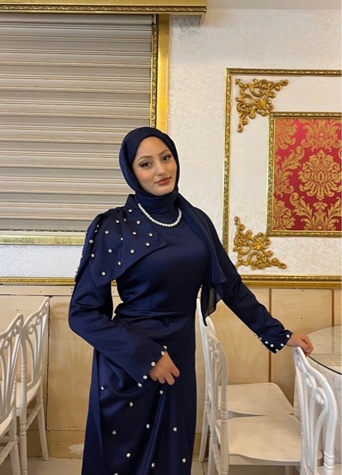 Lacivert, uzun kollu ve yüksek yakalı bu abiye elbise, drapeli detaylara sahip. Düzenli kesimi ve etnik parlak desenleriyle düğünler için uygun. ✨