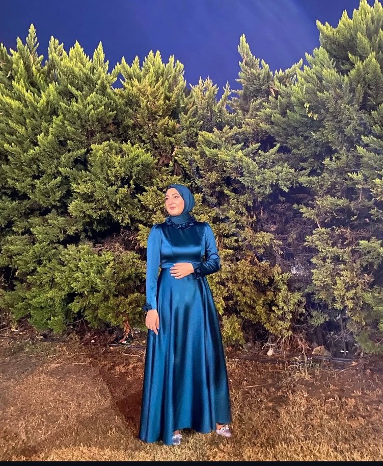 Uzun lacivert elbise, yüksek yakalı ve uzun kollu, vücuda oturan kesime sahip. Drapeli tasarımı bohem stilini yansıtıyor, mütevazı düğünler için uygun.