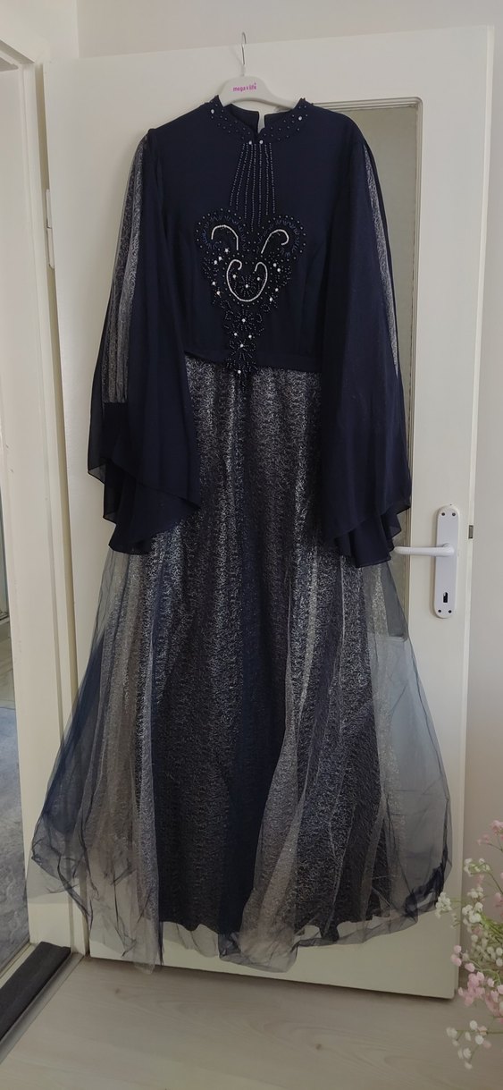 Uzun lacivert renkte, drapeli uzun kollu ve tekne yaka tasarıma sahip, bol kesim gotik stil kadın abiye. Klasik şıklık sunar, desensizdir. ✨