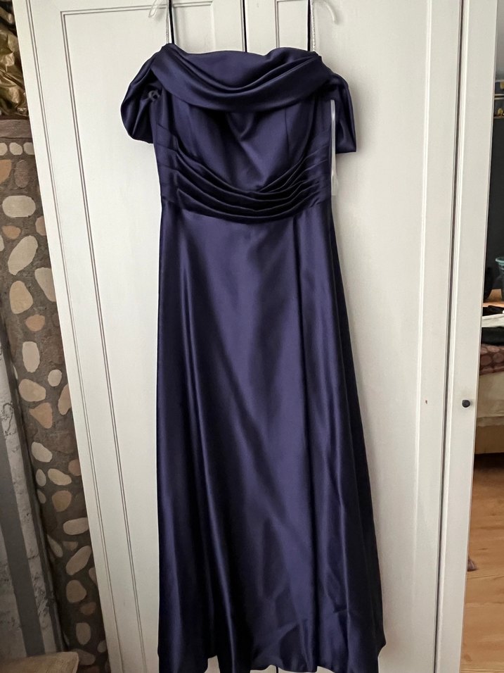 Lacivert renkte, drapeli tekne yaka ve kolsuz uzun abiye elbise. İnce kesimi ve modern klasik tarzıyla düğünler için uygun.