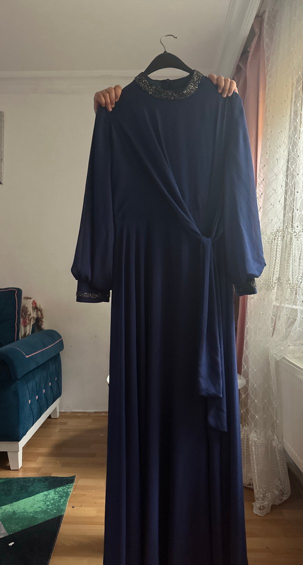 Yüksek yakalı ve uzun kollu, drapeli ve bol kesimli uzun lacivert abiye elbise. Düğünler için uygun, mütevazı ve klasik tarzda.