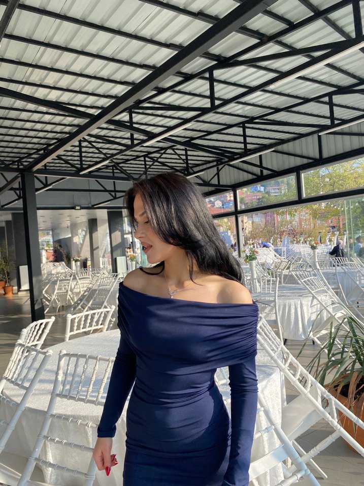 Uzun Lacivert Drapeli Kadın Elbise