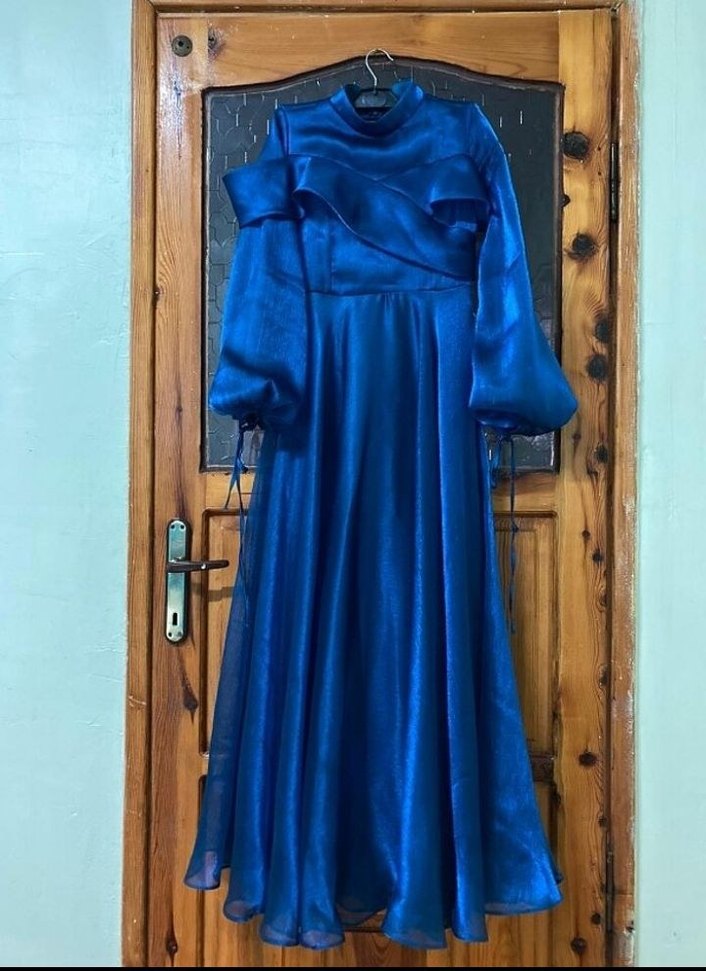Uzun lacivert elbise parlak kumaş, drapeli detay, tekneden yaka ve uzun kolludur. Bol kesim ve modern klasik tarzda, düğünler için uygundur.