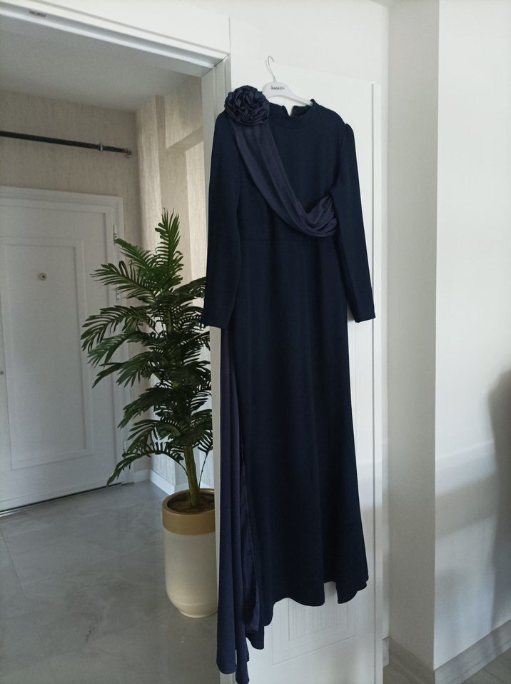 Lacivert renkte, yüksek yakalı ve uzun kollu, omuzda çiçek detayı ve drapeli uzun elbise. İpek gibi kumaş ve klasik Paris tarzı, ofis için uygun.