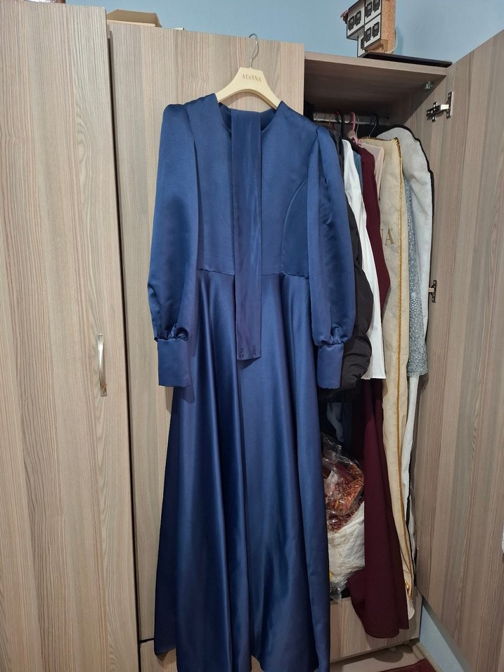 Uzun lacivert renkte, yakası kesik ve uzun kollu, drapeli tasarıma sahip modern klasik kadın elbisesi. Ofis kullanımı için uygun. 42 44 bedene uygun kemerli