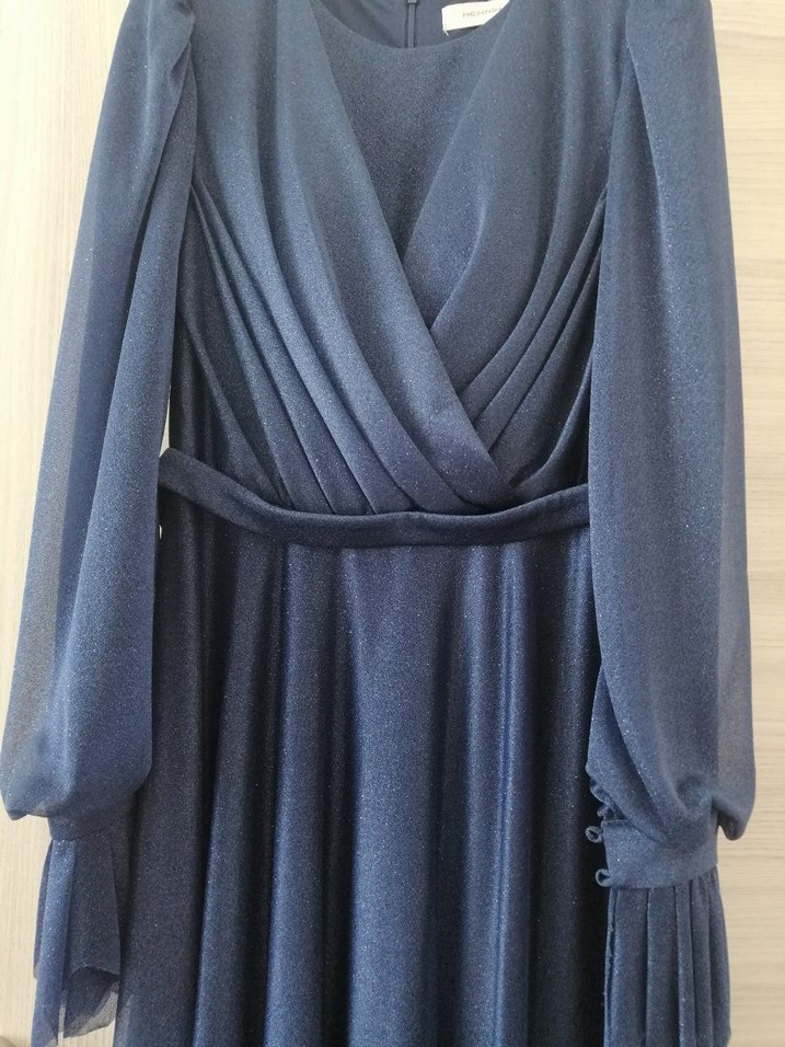 Uzun lacivert elbise, drapeli tasarımı, V yaka ve uzun kollu. Rahat kesimi ve modern klasik tarzıyla uygun. Bir kez kullanıldı