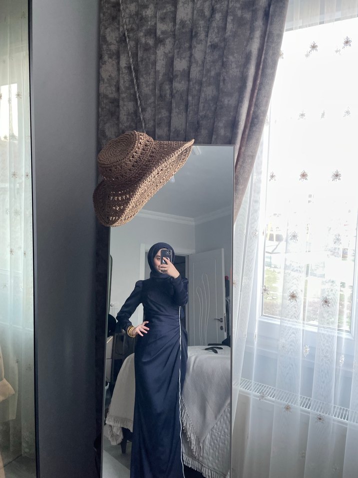 Uzun, lacivert renkte, yüksek yakalı ve askılı kollu, drapeli saten kumaştan yapılmış, modest ve Paris tarzı bohem uzun elbise.