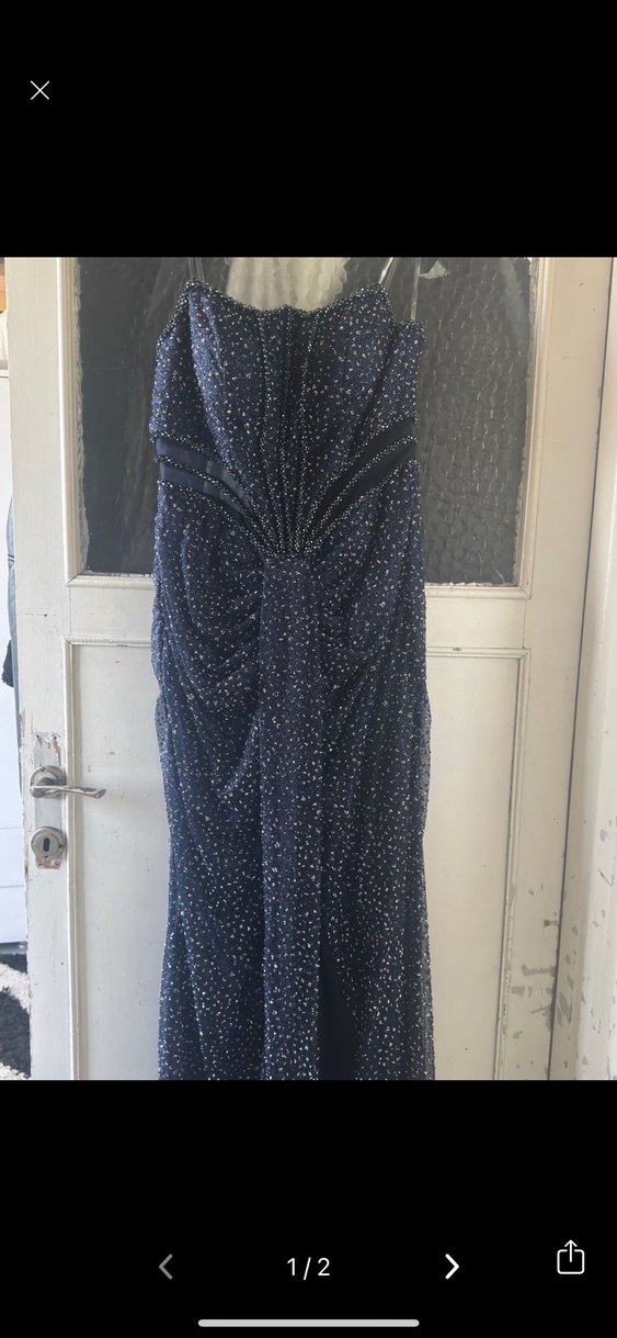 Lacivert, straplez yaka ve drapeli detaylı, uzun ve vücuda oturan abiye elbise. Desenli kumaşıyla parti için şık ve gösterişli bir seçim. ✨