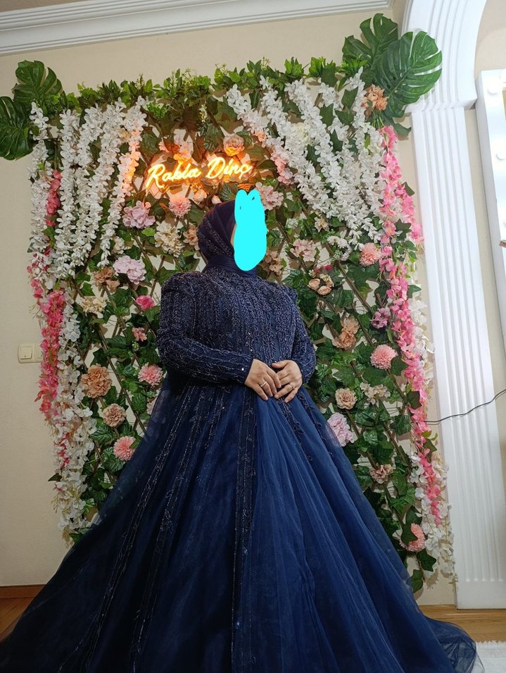 Uzun, fit kesim lacivert gelinlik, drapeli detaylar ve yüksek yakalıdır. Uzun kollu, sade ve koyu renkte, gotik ve bohem tarzlara uygundur.