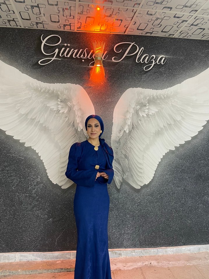 Uzun, regular fit lacivert abiye, yüksek yakalı ve uzun kollu, drapeli tasarıma sahip. Minimalist, normcore stil, desensiz. Marka: GinstPlaza.