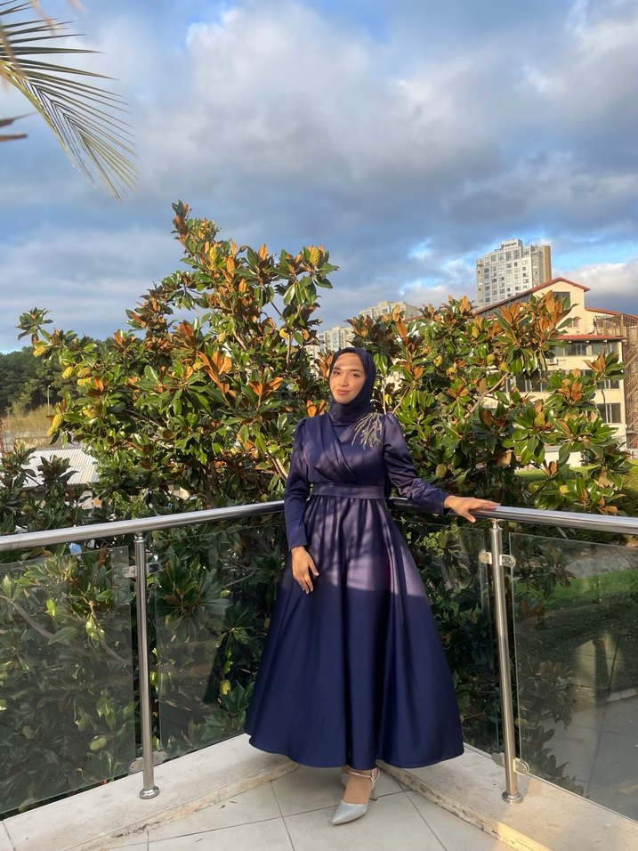 Uzun lacivert renkte, yüksek yakalı ve uzun kollu, drapeli tasarıma sahip modest abiye.40-42 beden uyumlu düğünler için uygundur.Saten kumaş
