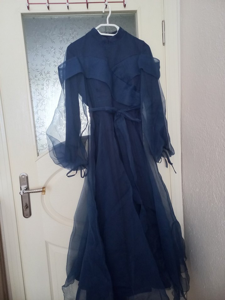 Lacivert uzun abiye elbise, drapeli detaylar, uzun kollu ve yüksek yakalıdır. Gevşek kesim ve gotik tarzda, düğünler için uygundur. Boy:130 cm 1 kere giyildi